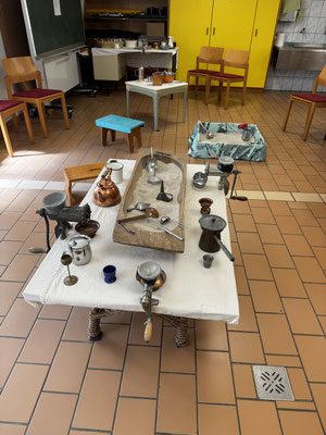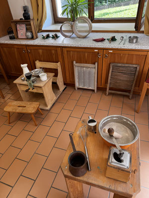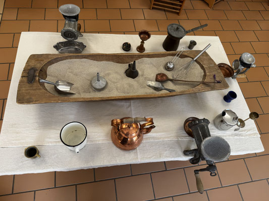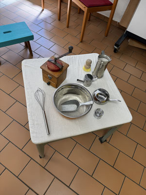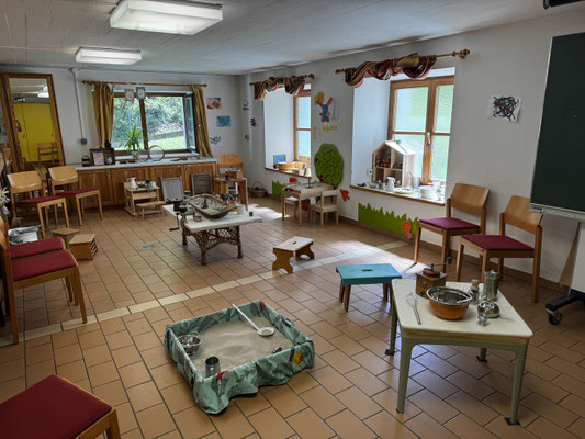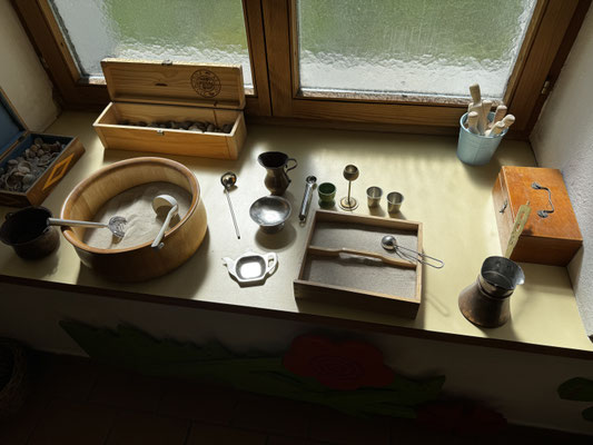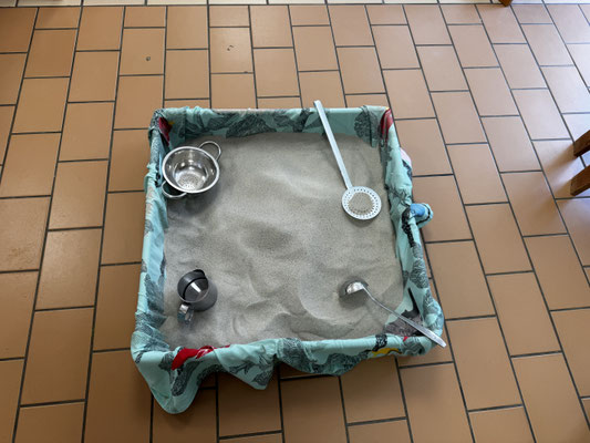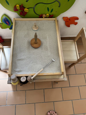 Feiner trockener Quarzsand lädt im SandRaum zum Experimentieren, Verweilen, Forschen, Rieseln, Schütten und Entdecken ein. Schon Kleinkinder, kaum dass sie stehen können, nutzen dieses Angebot, um mit Hingabe, Eifer und Freude das, was sie ihre Eltern in der Küche tun sehen, endlich ohne Einmischung auch selbst tun zu können. Es wird „Sandkaffee“ oder „Sandsuppe“ und noch vieles mehr gekocht, serviert und von den Eltern dankbar angenommen. Das Erlebnis, dass der Sand im SandRaum auf den Boden fallen darf, erhöht die Spielintensität und großzügig wird auf die schon randvollen Kaffeekannen, Töpfchen und Schüsseln noch mehr und noch mehr Sand gehäuft. Solange bis er sich über den Rand der Töpfe, über die Tischkante bis auf den Boden ergießt. Am Fleischwolf oder der Kaffeemühle können beim Sand durchmahlen überschüssige Kräfte abgearbeitet werden, um dann zu erleben, wie der Sand als feiner Strahl auf der unteren Seite wieder herausfließt.